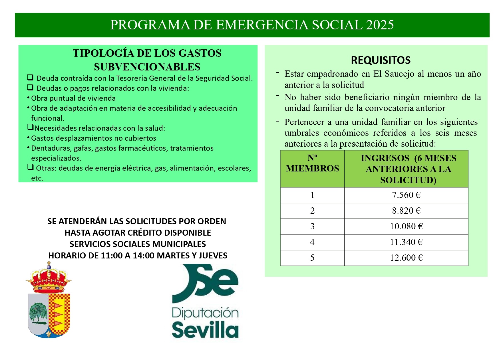 Ya puedes solicitar el Programa de Emergencia Social en, Servicios Sociales Municipales, en horario de 11:00h a 14:00 h martes y jueves.