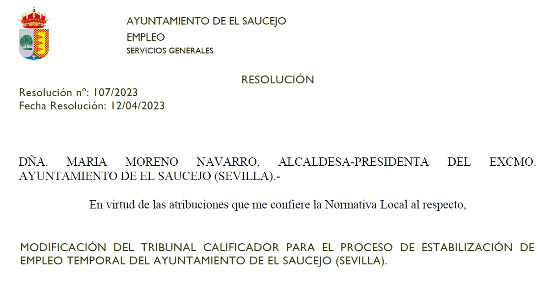 Mediante la siguiente Resolución de Alcaldía se decreta modifcar la composición del Tribunal Calificador para el Proceso de Estabilización de Empleo Temporal del Ayuntamiento de El Saucejo.