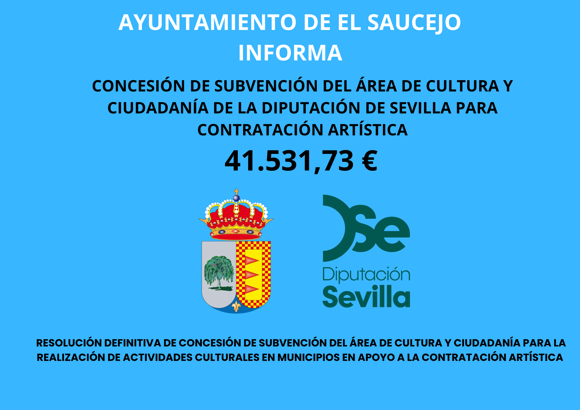 Se publica la resolución definitiva de la convocatoria de subvenciones del Área de Cultura y Ciudadanía de la Diputación de Sevilla, nuestro municipio ha sido beneficiario de una ayuda por importe de 41.531,73 €. Esta subvención está destinada al apoyo de la contratación artística, contribuyendo al impulso de la cultura y al enriquecimiento de la programación cultural local.