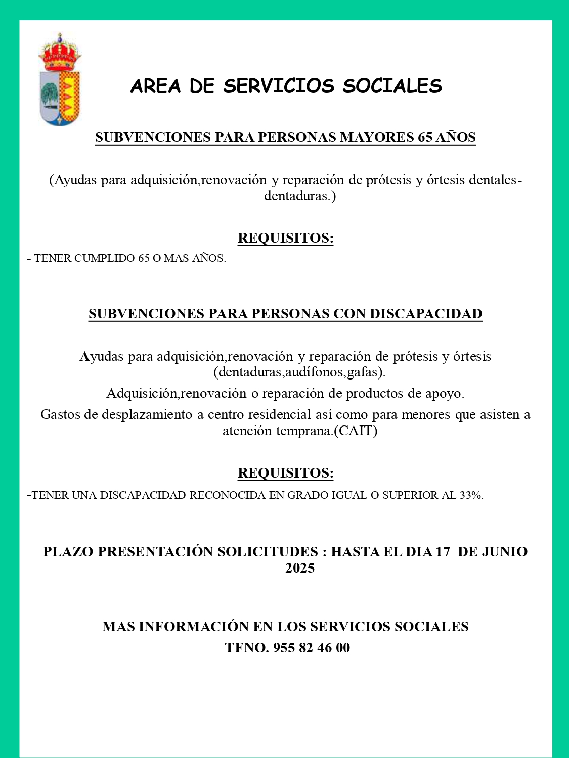 ✅SUBVENCIONES PARA PERSONAS MAYORES DE 65 AÑOS ⏺ Ayudas para adquisición, renovación, reparación de prótesis y órtesis dentales (dentaduras). ✅SUBVENCIONES PARA PERSONAS CON DISCAPACIDAD ⏺ Ayudas para adquisición, renovación y reparación de prótesis y órteis (dentaduras, audífonos, gafas). ⏺ Adquisición, renovación o reparación de productos de apoyo. ⏺ Gastos de desplazamiento a centro residencial, así como para menores que asisten a atención temprana (CAIT). 📆PLAZO PRESENTACIÓN SOLICITUDES: HASTA EL 17 DE JUNIO 2025. ℹ️MÁS INFORMACIÓN: SERVICIOS SOCIALES ☎️Teléf. 955 82 46 00
