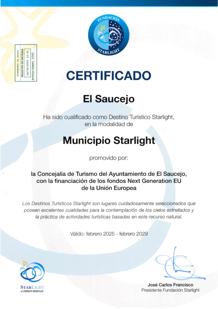 El Saucejo, nuevo Destino Turístico Starlight. Nos enorgullece anunciar que El Saucejo ha recibido la certificación como "Destino Turístico Starlight", un reconocimiento que lo incorpora a la red de "municipios Starlight", comprometidos con la protección del cielo nocturno y la divulgación de la astronomía. Desde la Concejalía de Turismo, seguiremos trabajando para fomentar el astroturismo y poner en valor la riqueza de nuestro cielo, convirtiéndolo en un recurso único para visitantes y vecinos