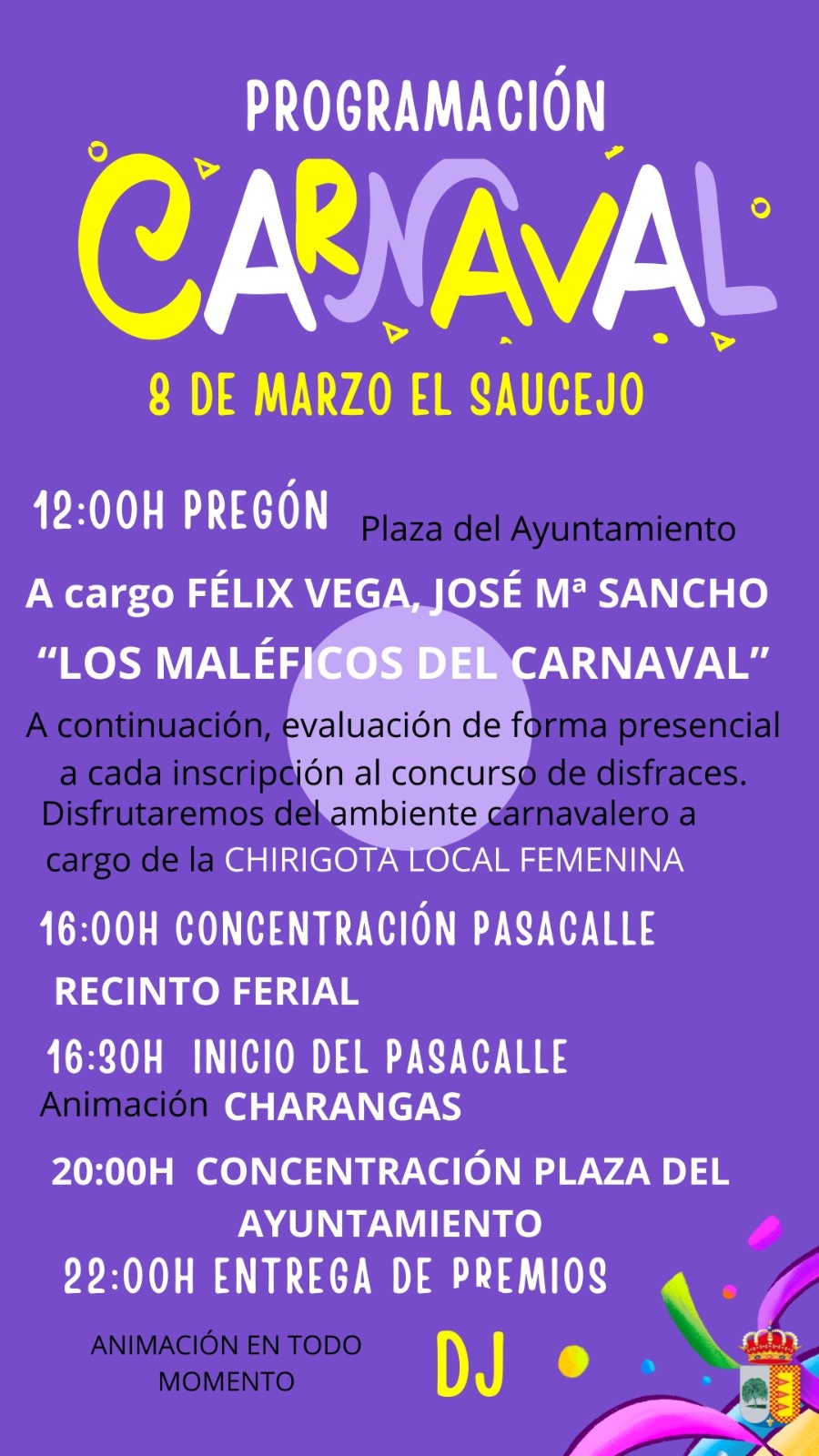 PROGRAMACIÓN🎭🎭 CARNAVAL 8 DE MARZO Desde la concejalía de Festejos estamos pendientes del tiempo meteorológico por si hubiera algún cambio de última hora, ya que aún es precipitado hablar de cambios, os iremos informando. El Carnaval da comienza a las 12:00h del mediodía con el tradicional Pregón a cargo de FÉLIX VEGA GARRIDO Y JOSÉ MARÍA SANCHO ÁLVAREZ "LOS MALÉFICOS DEL CARNAVAL" dando paso al concurso de disfraces, todos mostrando su creatividad y ganas de divertirse. Este evento se vive en la Plaza del Ayuntamiento, donde se disfrutará de un ambiente muy carnavalesco, con DJ animando la fiesta y la CHIRIGOTA LOCAL "LAS PACAS" llenando de humor y música el ambiente. Mientras tanto, los asistentes disfrutan de una convivencia animada entre los bares, este año como novedad sé instala servicio de barra por la asociación de Nuestro Padre Jesús Nazareno, creando una atmósfera única de tertulias y risas. A las 16:00h de la tarde, concentración en el Recinto Ferial, a las 16:30h dará comienzo el tradicional pasacalle, un desfile que recorre las calles del pueblo durante unas 4 horas, acompañada todo momento con la charanga " LOS PITONGOS" y la charanga " LOS TERCIOS", llevando la fiesta a todos los rincones. La jornada culmina en la Plaza del Ayuntamiento, donde se disfruta de música en directo y DJ, a partir de las 22:00h se procede a la entrega de premios, Este momento es el broche de oro, premiando la originalidad, el esfuerzo y el entusiasmo de todos los participantes. ¡Un carnaval que nos llena de orgullo y emoción cada año! ¡MAÑANA ÚLTIMO DÍA DE INSCRIPCIÓN!!!!!