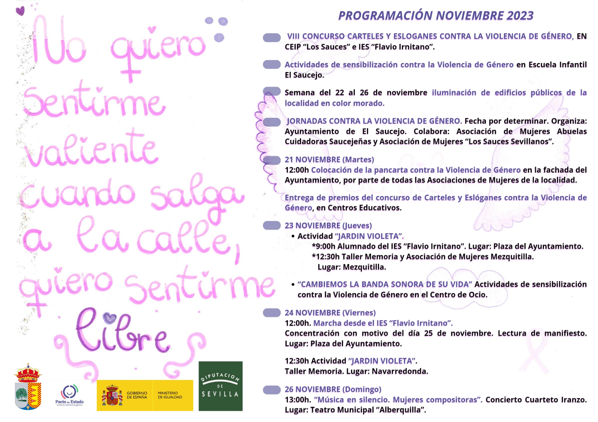 CARTEL DE LA PROGRAMACIÓN CONTRA LA VIOLENCIA DE GÉNERO NO QUIERO SENTIRME VALIENTE CUANDO SDALGA A LA CALLE, QUIERO SENTIRME LIBRE