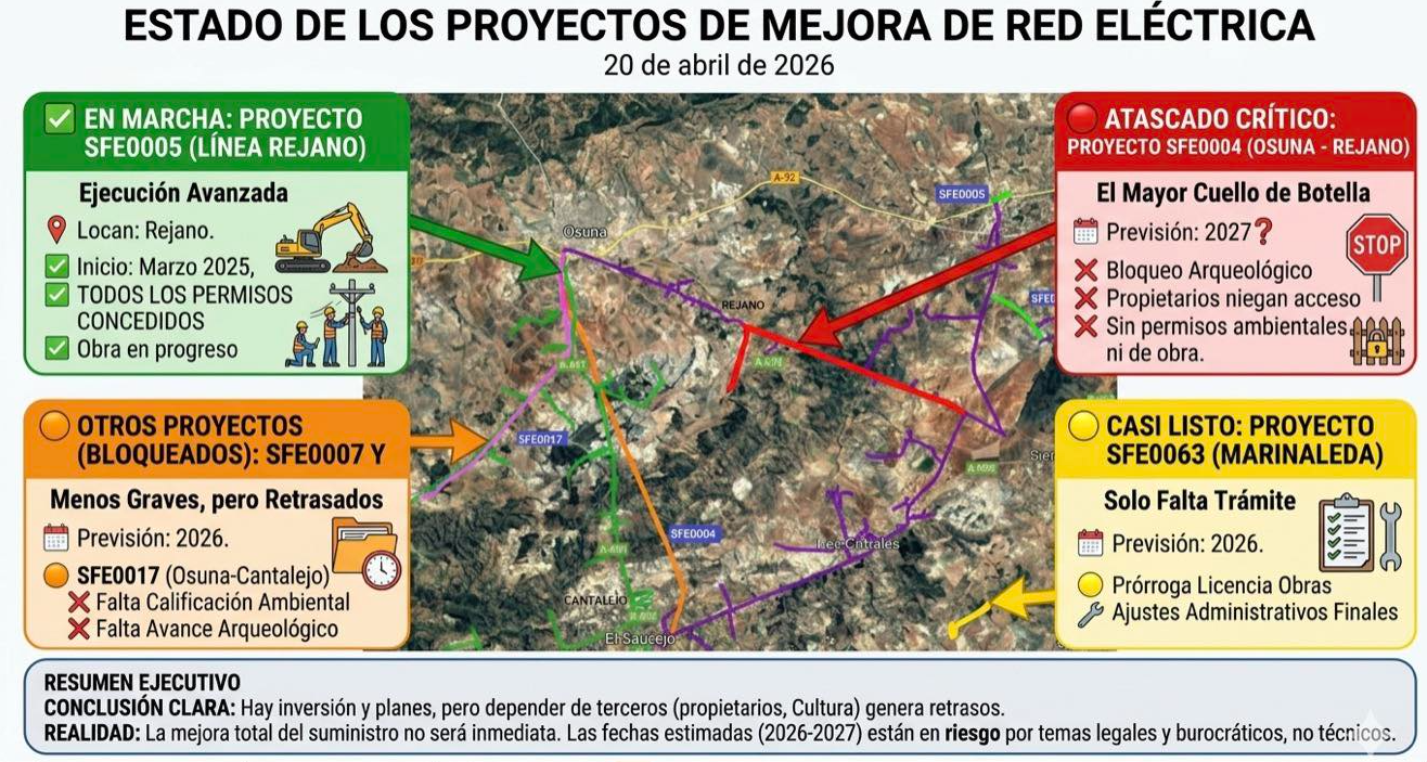 Contestación del Defensor del pueblo. La Junta de Andalucía reconoce retrasos en los proyectos para mejorar el suministro eléctrico en la Sierra Sur de Sevilla, donde solo una actuación está en marcha y el resto sigue bloqueado por trámites administrativos, permisos y falta de acceso a terrenos privados. Municipios como El Saucejo, Los Corrales, Martín de la Jara, Algámitas y Villanueva de San Juan continúan sufriendo cortes frecuentes. La alcaldesa María Moreno Navarro, califica la situación de “insostenible” y denuncia que es un problema estructural que afecta a la vida diaria y al desarrollo económico. Uno de los principales proyectos no se ejecutará hasta 2027, lo que refleja, según la alcaldesa, una falta de agilidad administrativa. Exige soluciones urgentes, plazos concretos y una actuación coordinada para garantizar un suministro eléctrico estable.