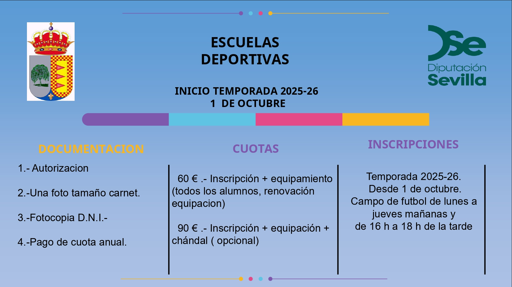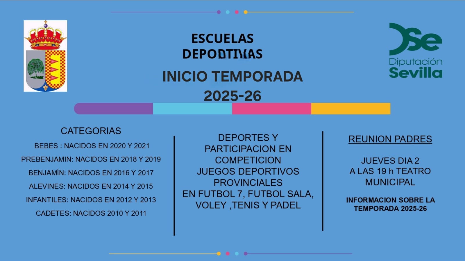 Escuela Deportiva Municipal – Temporada 2025/2026 El Ayuntamiento de El Saucejo informa que ya están disponibles los horarios de la Escuela Deportiva Municipal para la temporada 2025/2026. Las actividades están dirigidas a niños, niñas y jóvenes de diferentes edades. Desde el Ayuntamiento seguimos apostando por el deporte como herramienta fundamental para el desarrollo físico, social y personal de nuestros vecinos y vecinas. Para consultar los horarios completos y formalizar inscripciones, desde el 1 de octubre en horario de 16:00 h a 18:00 h acudir al Campo de fútbol Municipal. ¡Anímate a participar y forma parte del deporte saucejeño!