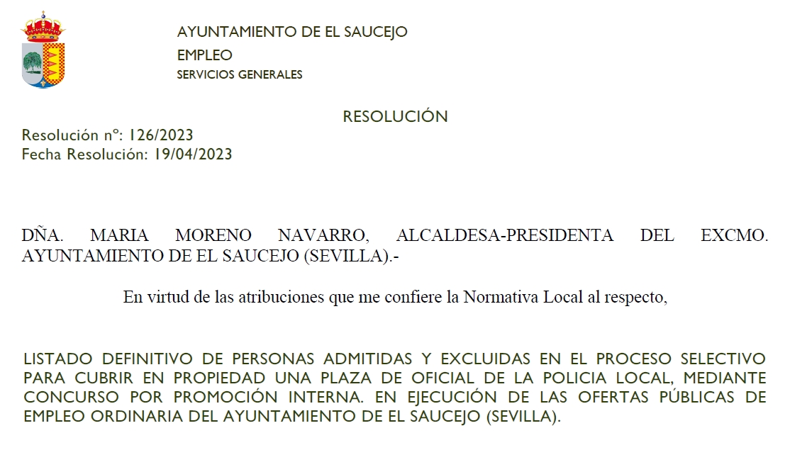 Mediante la siguiente resolución se hace público el listado definitivo de personas admitidas y excluídas en el proceso selectivo para cubrir en propiedad una plaza de oficial de la Policía Local, mediante concurso por promoción interna. En ejecución de las ofertas públicas de empleo ordinaria del Ayuntamiento de El Saucejo (Sevilla).