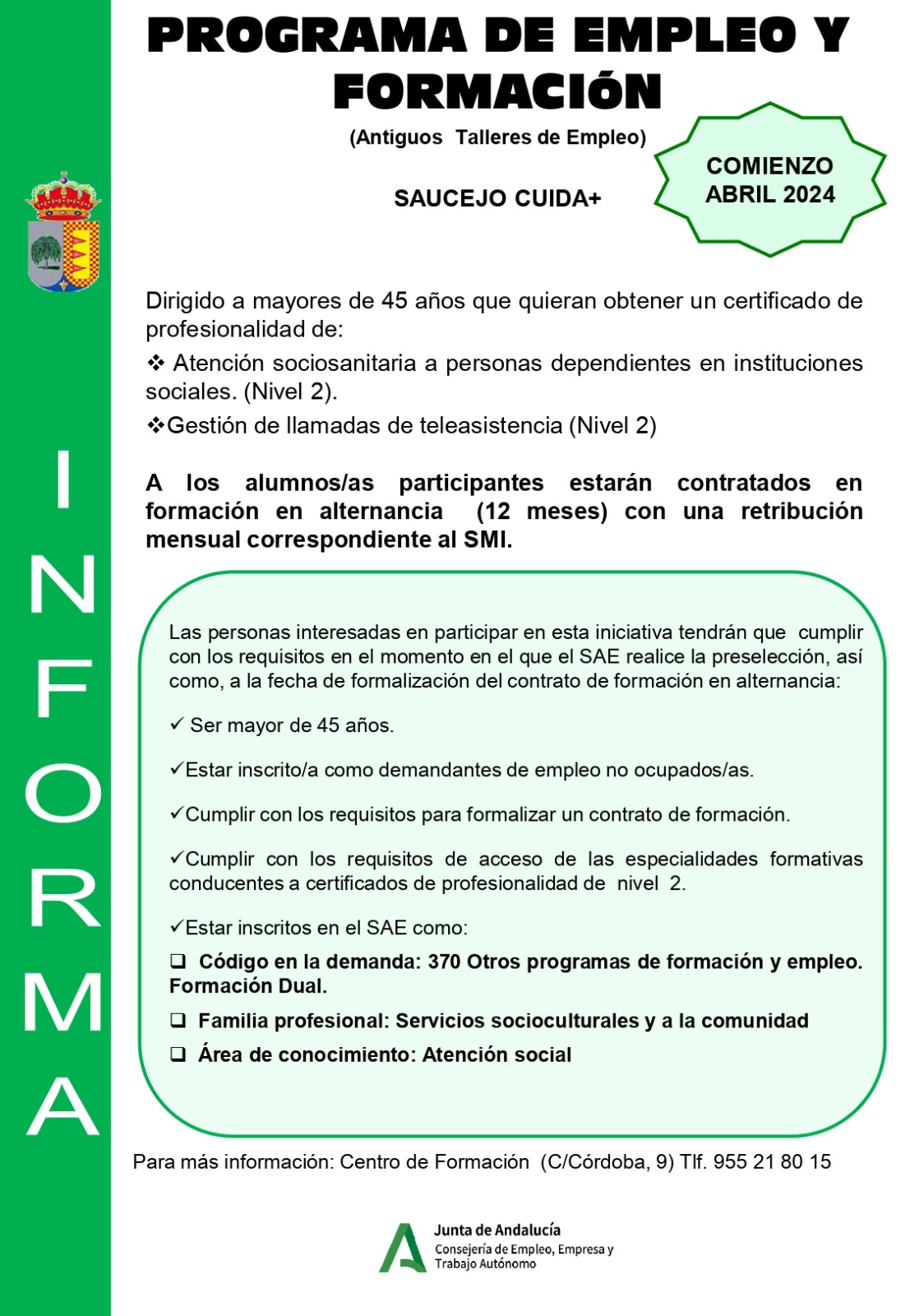 SAUCEJO CUIDA+ Para mayores de 45 años. Delegación de Empleo, empresa y Trabajo Autónomo de la Junta de Andalucía.
