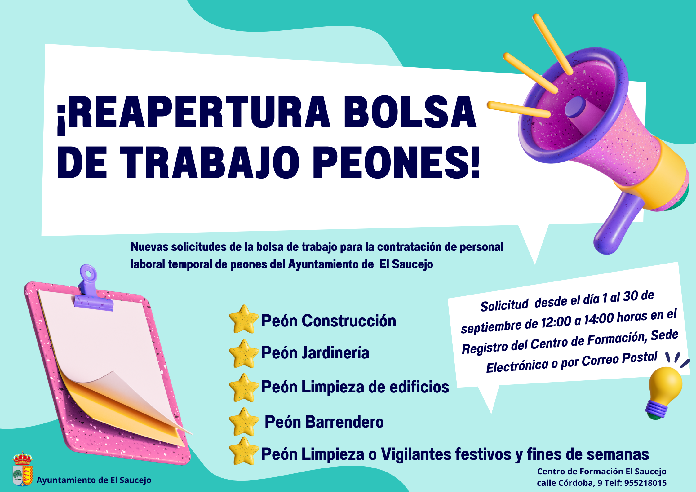 Abierto plazo de solicitud del día 1 al 30 de septiembre, ambos inclusive, en horario de 12:00 a 14:00 horas, en el Registro del Centro de Formación, Sede Electrónica o por Correo Postal.