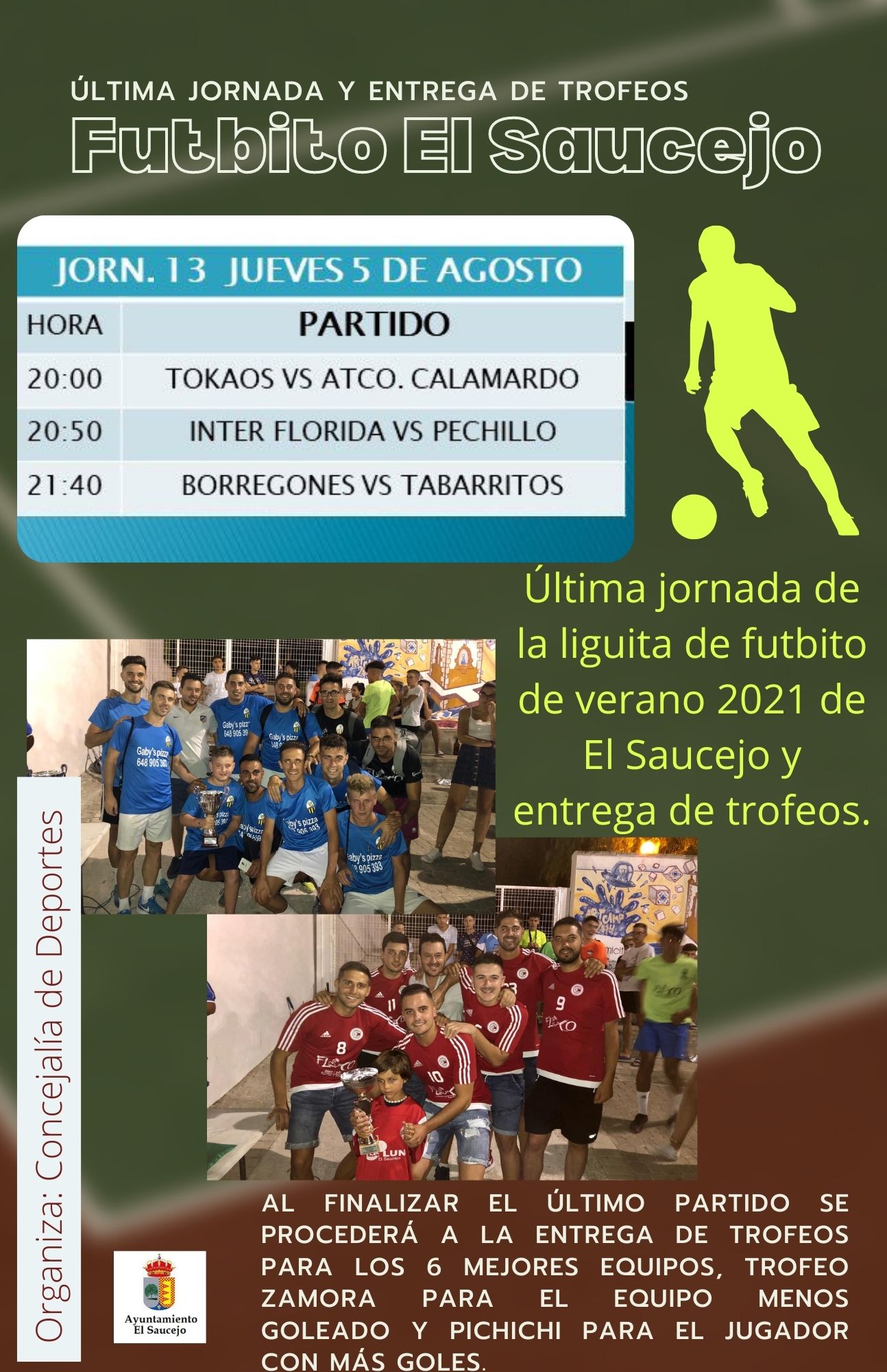 A las 22:30h se procede a la entrega de trofeos en la cual, los 6 primeros equipos recibirán premio. Además, premio especial Zamora al equipo menos goleado y trofeo Pichichi al jugador con más goles de la liga.