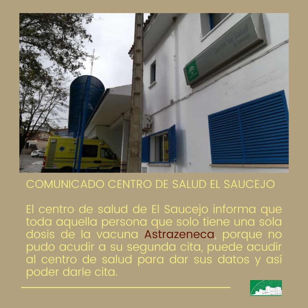 El centro de salud de El Saucejo informa que toda aquella persona que solo tiene una sola dosis de la vacuna Astrazeneca, porque no pudo acudir a su segunda cita, puede ir al centro de salud, dar sus datos y así poder conseguir su cita para la vacunación.