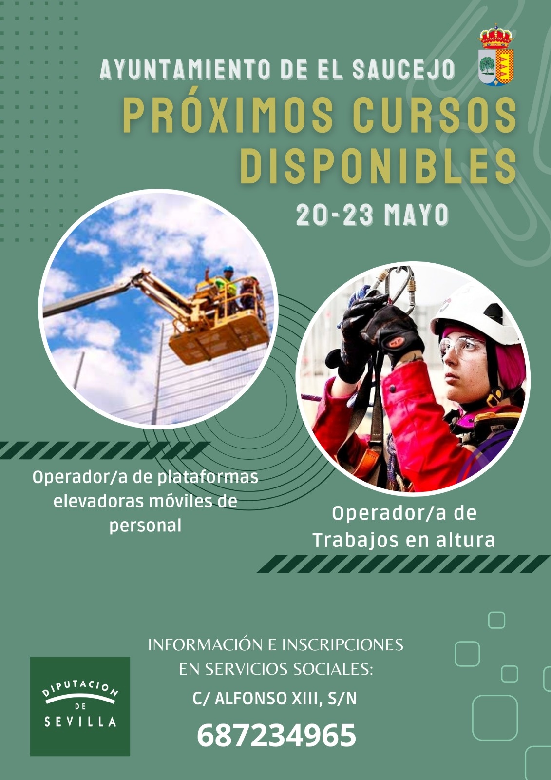 Operador/a de plataformas elevadoras móviles de personal. Operador/a de trabajos en altura. Información e inscripciones en Servicios Sociales de El Saucejo. 687 23 49 65