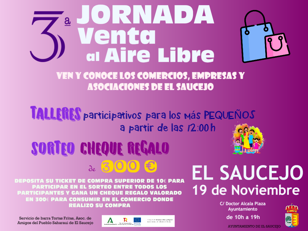 Donde comerciantes de El Saucejo dan visibilidad a sus negocios y Asociaciones DOMINGO 19 DE NOVIEMBRE Jornadas subvencionada por Consejería de Turismo, Cultura y Deporte, Junta de Andalucía, Plan de Recuperación Transformación y Resiliencia, Financiado por la Unión Europea.