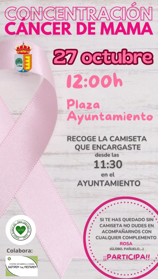 CONCENTRACIÓN CÁNCER DE MAMA🎗 27 DE OCTUBRE ⏰12:00 H 📍PLAZA DEL AYUNTAMIENTO A partir de las 11:30 h, podrás recoger tu camiseta previamente reservada en el Ayuntamiento. Queremos agradecer tu colaboración: la donación íntegra por las camisetas se destinará a la Asociación Contra el Cáncer. 💚