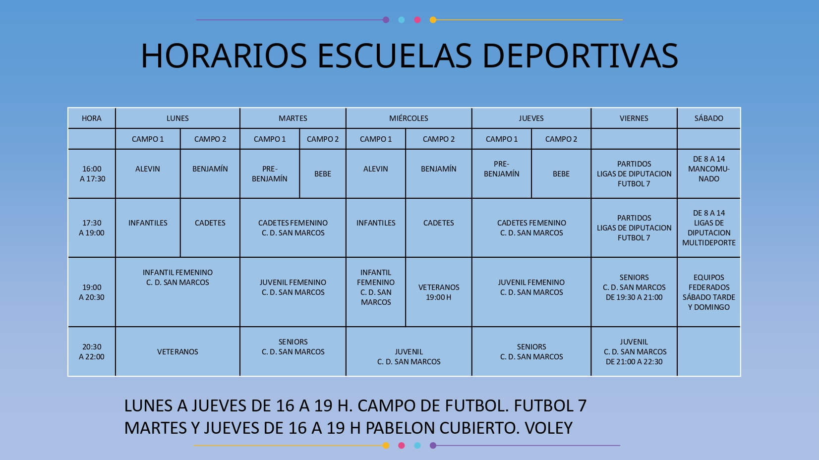 Escuela Deportiva Municipal – Temporada 2025/2026 El Ayuntamiento de El Saucejo informa que ya están disponibles los horarios de la Escuela Deportiva Municipal para la temporada 2025/2026. Las actividades están dirigidas a niños, niñas y jóvenes de diferentes edades. Desde el Ayuntamiento seguimos apostando por el deporte como herramienta fundamental para el desarrollo físico, social y personal de nuestros vecinos y vecinas. Para consultar los horarios completos y formalizar inscripciones, desde el 1 de octubre en horario de 16:00 h a 18:00 h acudir al Campo de fútbol Municipal. ¡Anímate a participar y forma parte del deporte saucejeño!